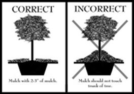 As beneficial as mulch is, too much can be harmful. The generally recommended mulching depth is 2 to 4 inches. Unfortunately, North American landscapes are falling victim to a plague of over- mulching. A new term, “mulch volcanoes,” has emerged to describe mulch that has been piled up around the base of trees. Most organic mulches must be replenished, but the rate of decomposition varies. Some mulch, such as cypress mulch, can remain intact for many years. Top dressing with new mulch annually (often for the sake of refreshing the color) creates a build-up to depths that can be unhealthy. Deep mulch can be effective in suppressing weeds and reducing maintenance, but it often causes additional problems.