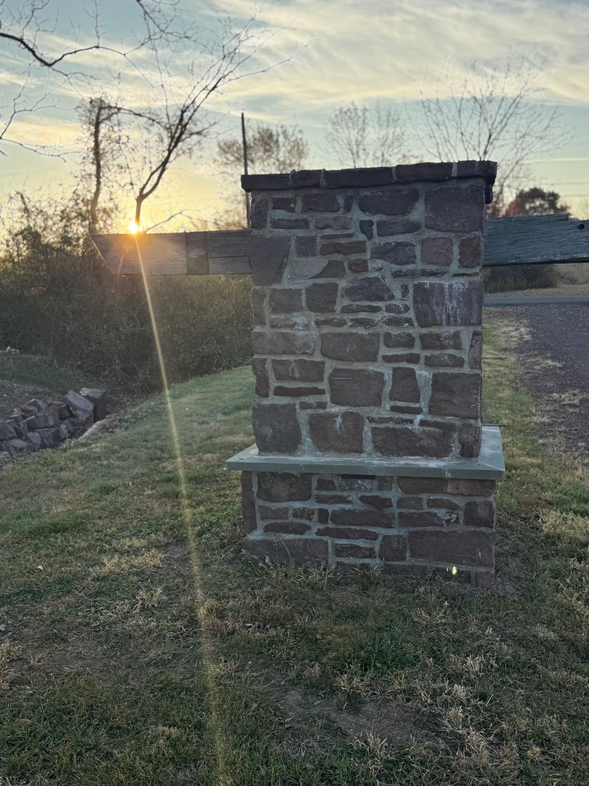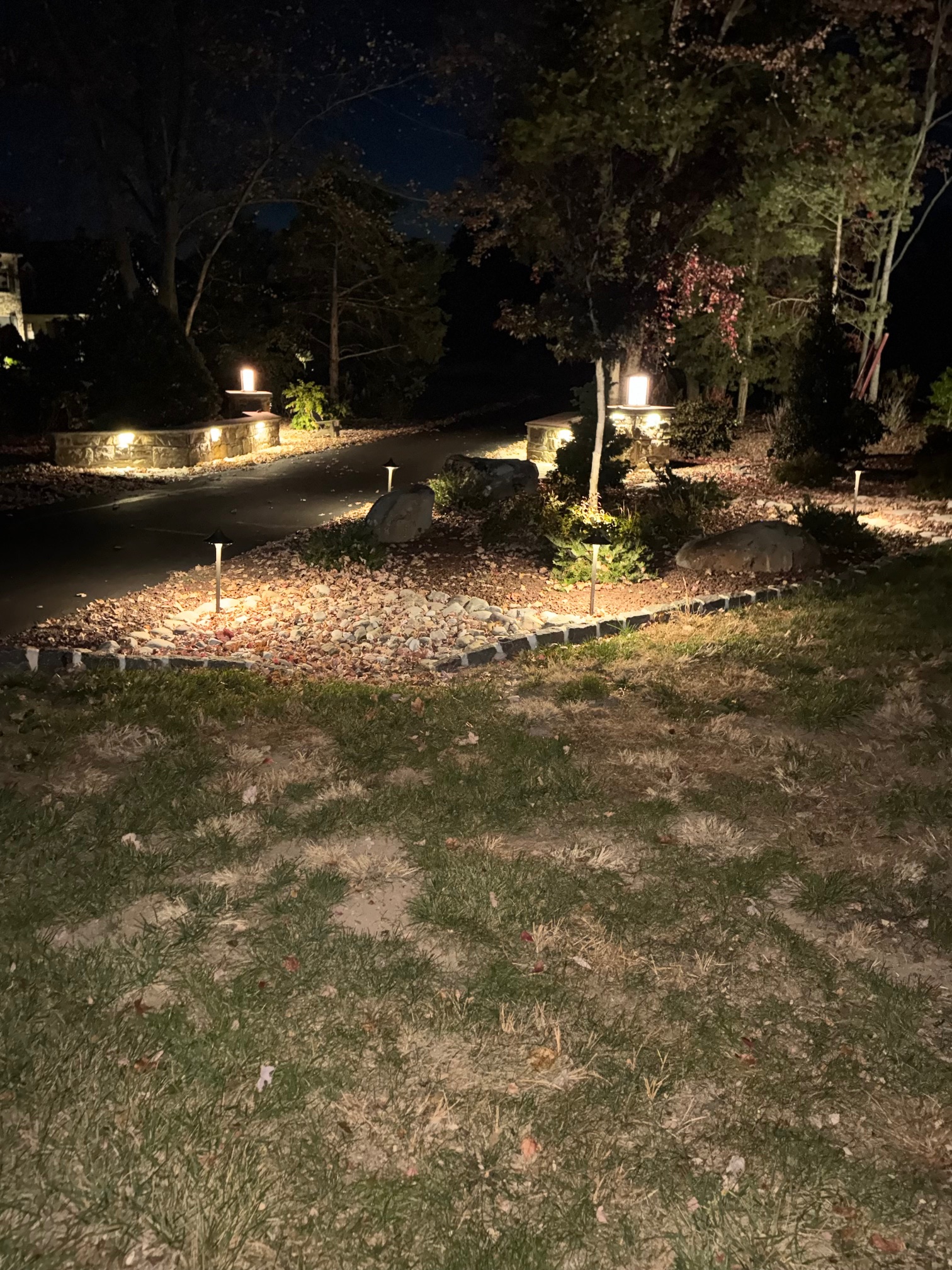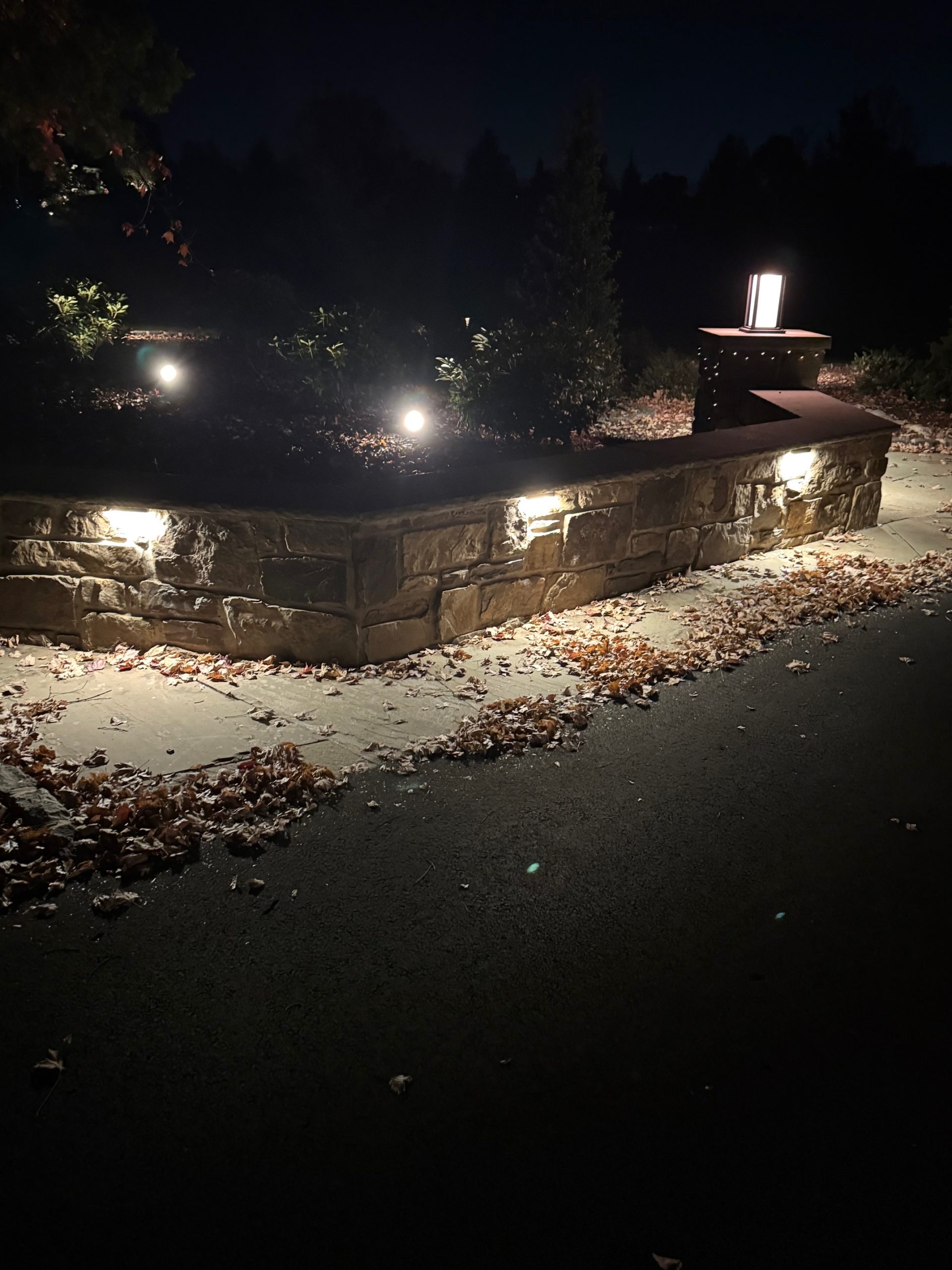This project was originally built in summer of 2022. HDN poured concrete footers and built cinderblock walls with stone veneer. This is capped with PA Blue Stone and Tru-Scapes Lighting was added for elegant night time lighting. This project was performed at an estate home located in Blue Bell, PA. Fall leaves gently cover the area.